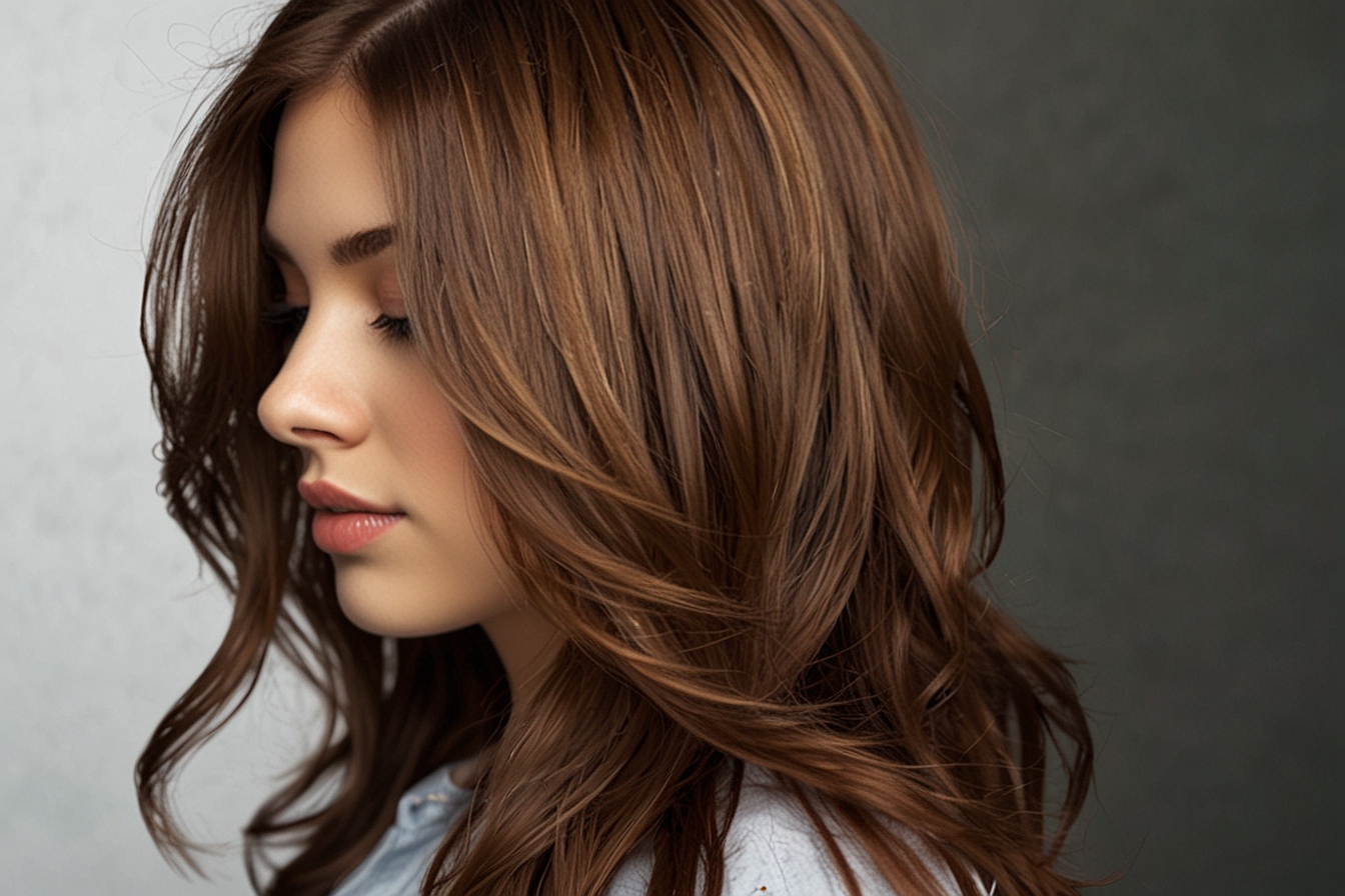 Warm, reflective brunette with caramel accents. Cozy for all; face-framing highlights.